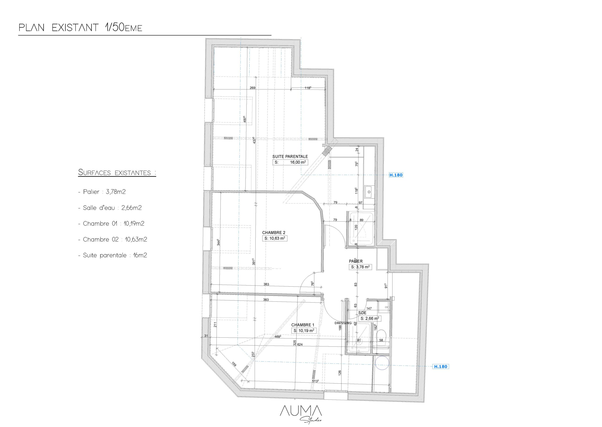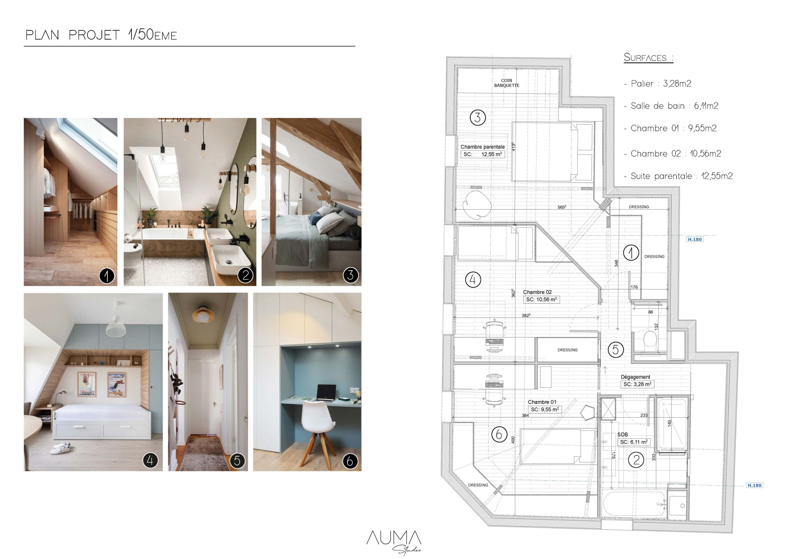 L’objectif étant de garder trois chambres, créer une salle de bain familiale, un sanitaire séparé et d’ajouter du linéaire de rangements.